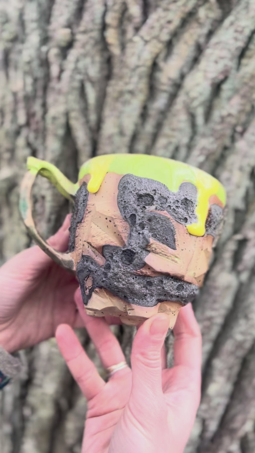 Dziki, ciosany i pojemny kubek ze szkliwem z fakturą przypominającą korę starego drzewa. Unikat.